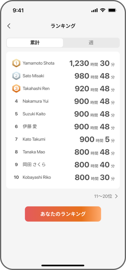 ランキング画面で「あなたのランキング」というボタンをタップすると、自分の順位を確認することができます。